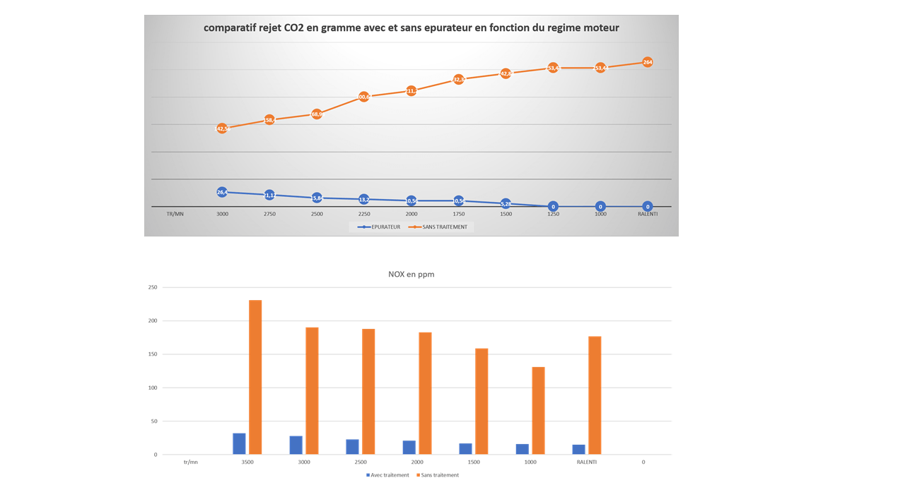 Et même au régime le plus élevé de 3 000 tr/mn le coefficient est encore supérieur à 5 donc une diminution encore de 80% du CO2 soit 142,56 g sans traitement et 26,4 g avec traitement !